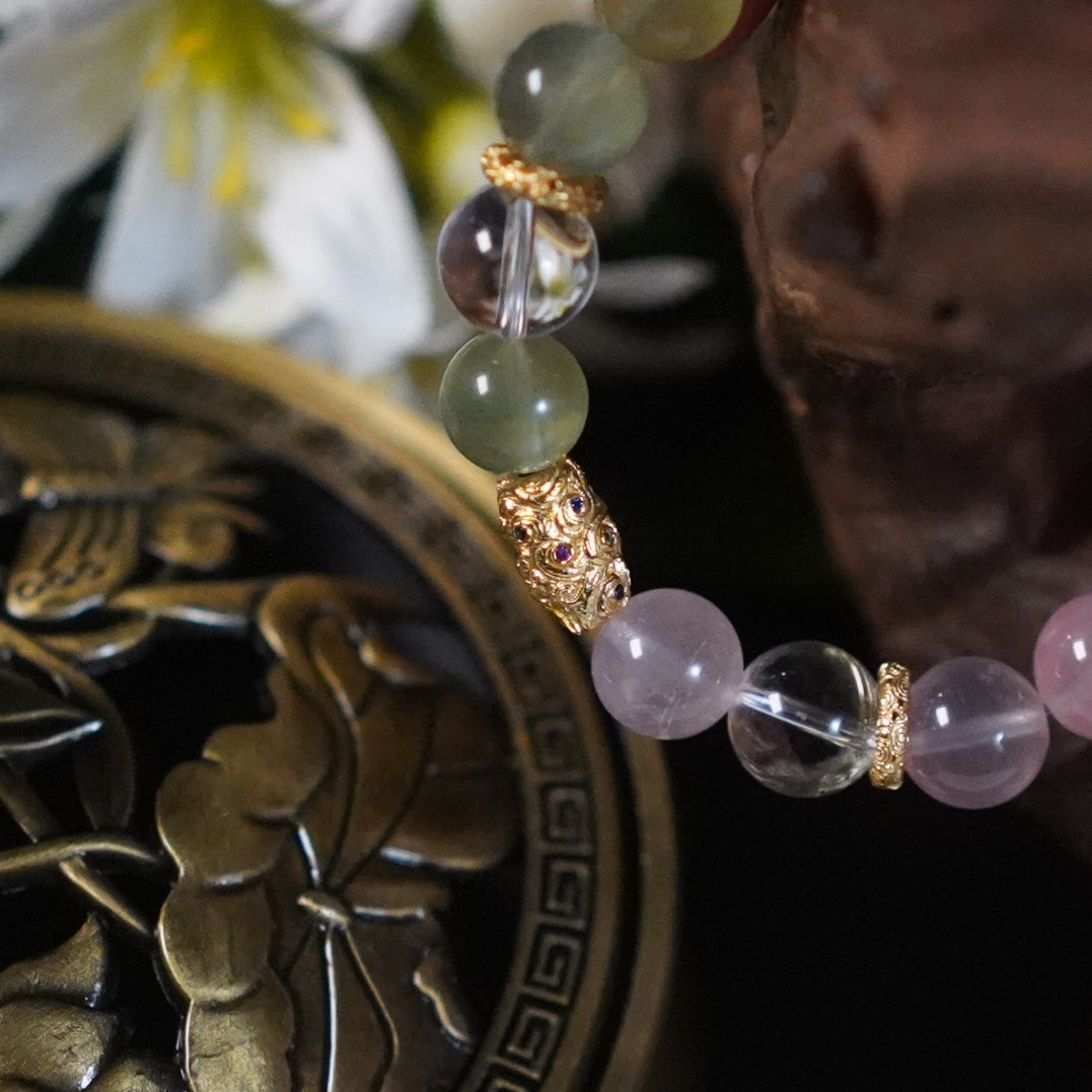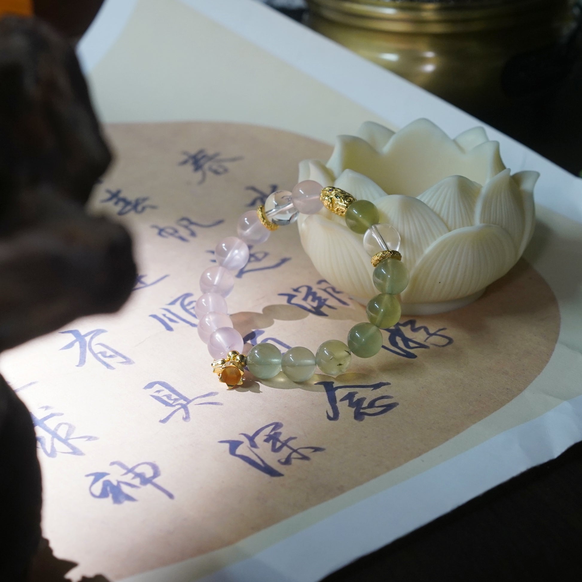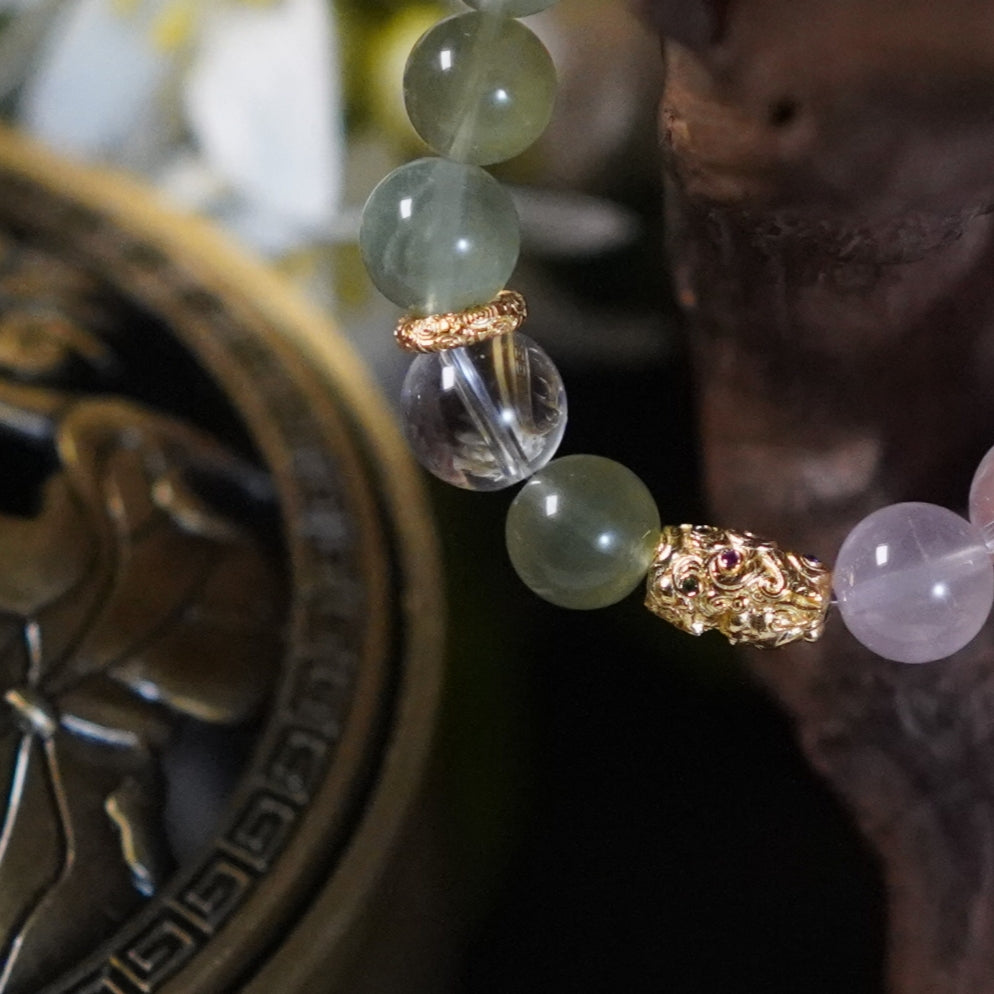 | Prehnite | Rose Quartz | Clear Quartz | Blue-Red-Green Diamond Nine-Tailed Barrel Bead | Twin Flames Teardrop Charm | Auspicious Cloud Movable Ring | Gold Bead |