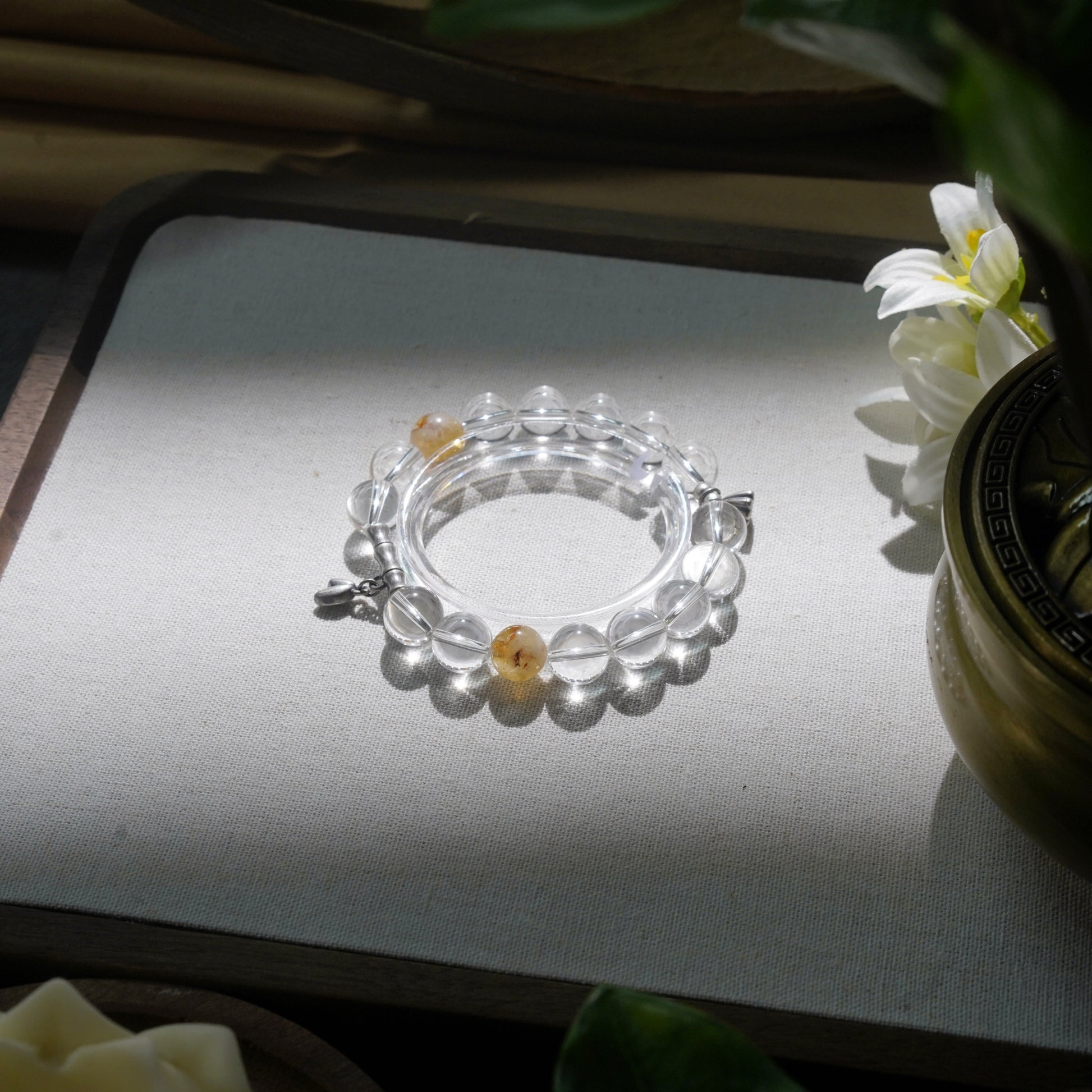 | Delicate inclusions emit a golden radiance, symbolizing clarity, optimism, and organic elegance. | Known as the “Mother of Energy,” clear quartz possesses powerful properties for absorbing and transforming energy, helping to clear negative energy from both the environment and personal energy fields. |