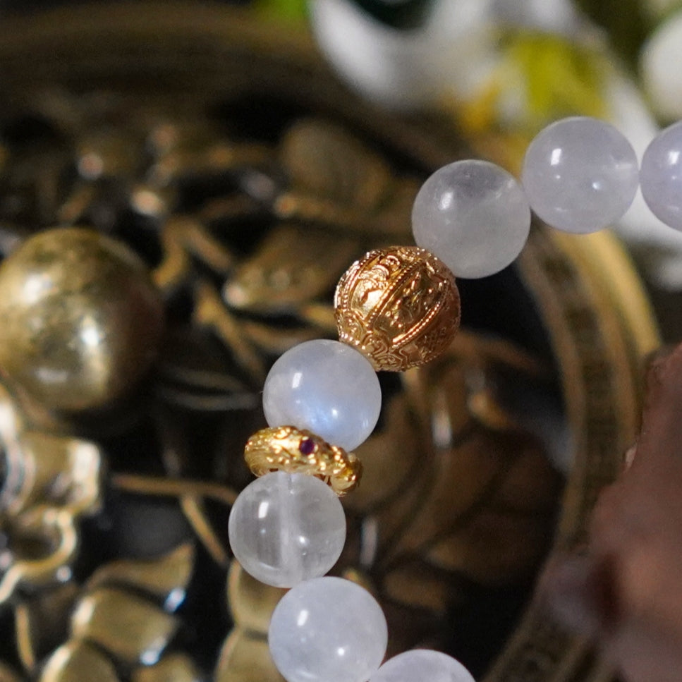 | Radiating with an ethereal blue glow, it illuminates inner resilience and clarity, transforming challenges into strength and graceful poise. | Infused with the protective essence of eight sacred Buddhist symbols, this bead symbolizes the dispersion of life’s obstacles—such as career blocks, interpersonal conflicts, and unexpected challenges—helping to end unfavorable cycles and invite smooth, steady flow. | In Chinese tradition, the dragon represents imperial authority and supreme power. The dragon head embodies leadership and decisive action, symbolizing the ability to take initiative and overcome adversity in one’s career. | Zha Ji Lamu is the only female deity of wealth in Tibetan culture, revered as the “Goddess of Fortune.” She is regarded as both a guardian and bestower of prosperity. |