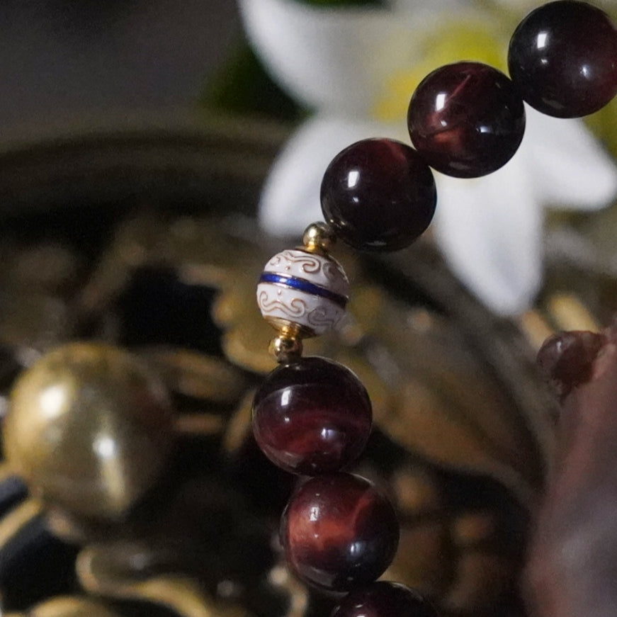 | Red Tiger's Eye | Enamel Wisdom Bead | Four-Sided Energy Rotator | Five-Mantra Barrel Bead |